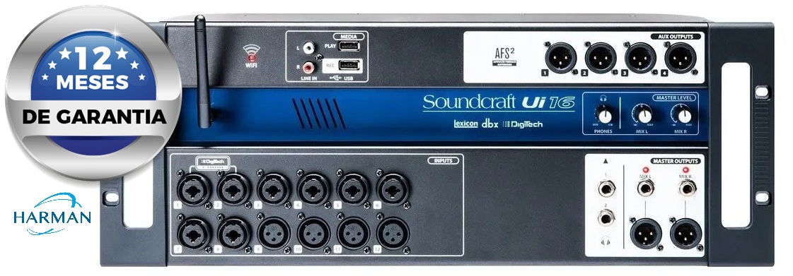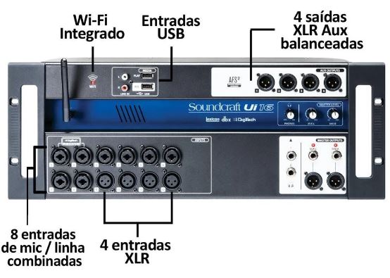 - Canais: 16 Entradas: 8 XLR MIC/LINE, 4 XLR MIC, 2 Hi-Z/Instrumento e 1 RCA LINE Estéreo